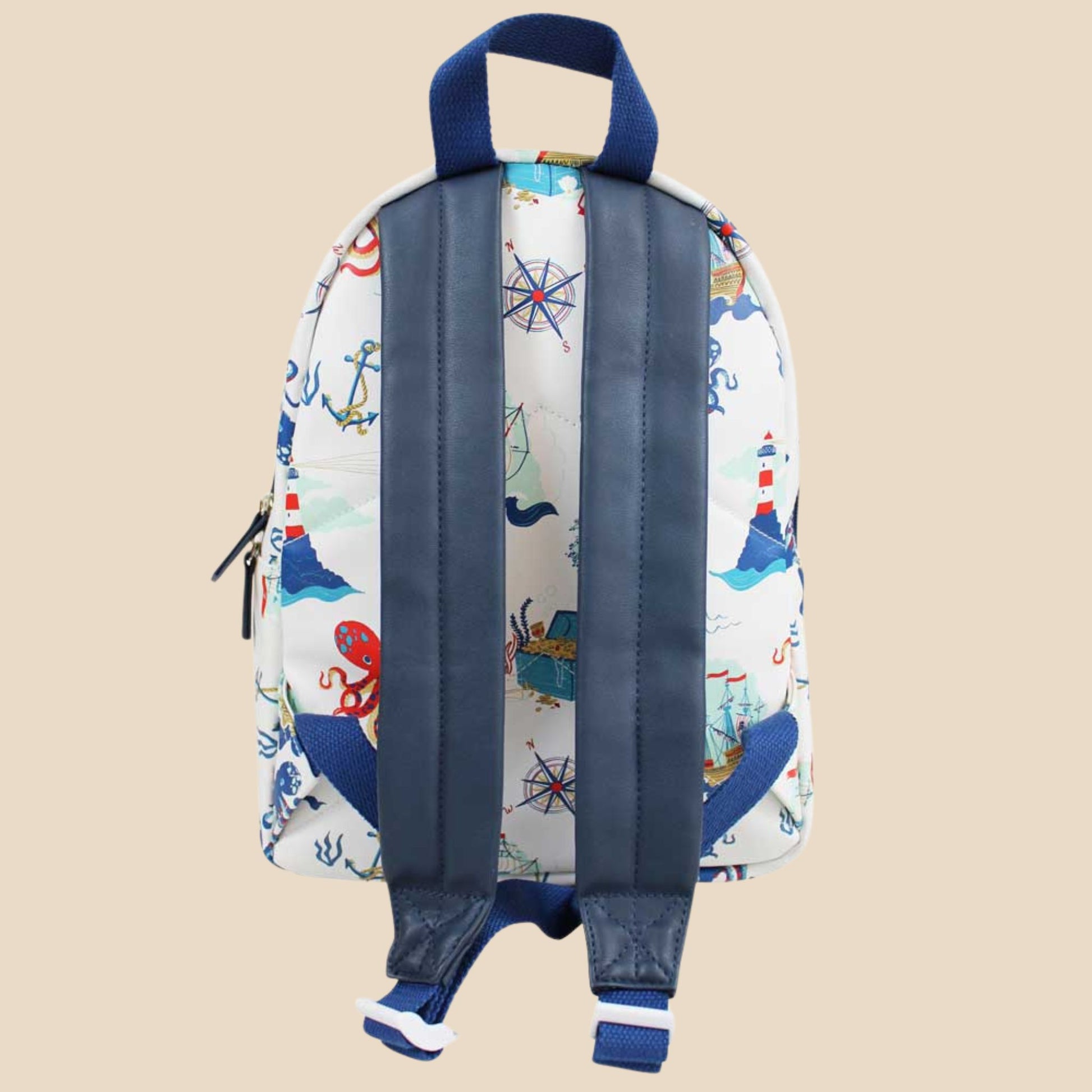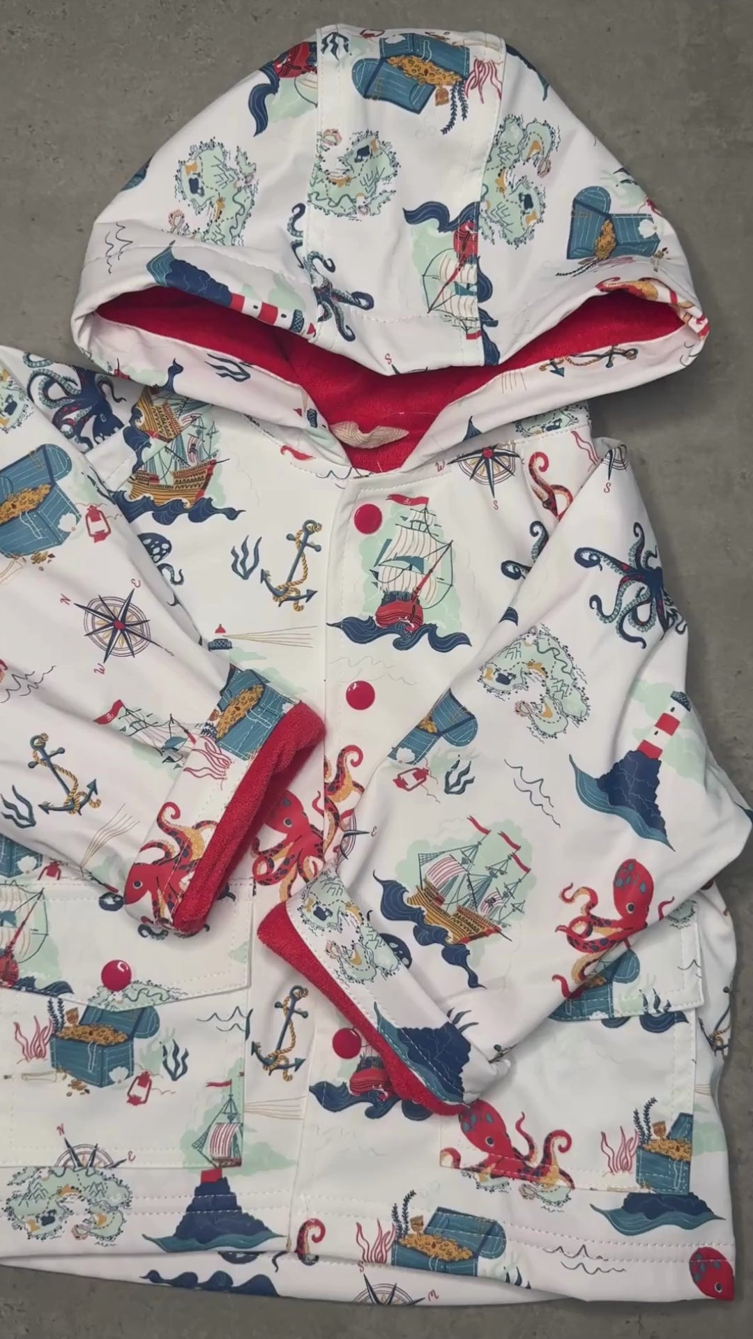 This playful nautical print is packed with swashbuckling detail — from red and blue octopuses to pirate ships, treasure chests, and intricate maps, all set against a crisp white background. A bold red towelling lining completes the look, adding warmth and a splash of colour to brighten rainy day.
