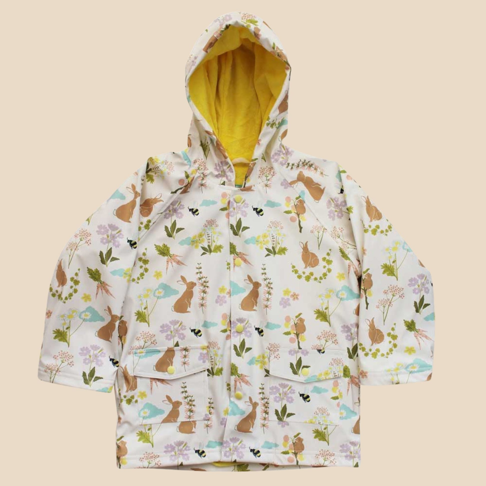 The whimsical meadow print is full of blooming wildflowers, playful rabbits, curious mice, and buzzing bees, all set against a fresh white background. A soft yellow towelling lining adds an extra pop of sunshine to this cheerful coat.