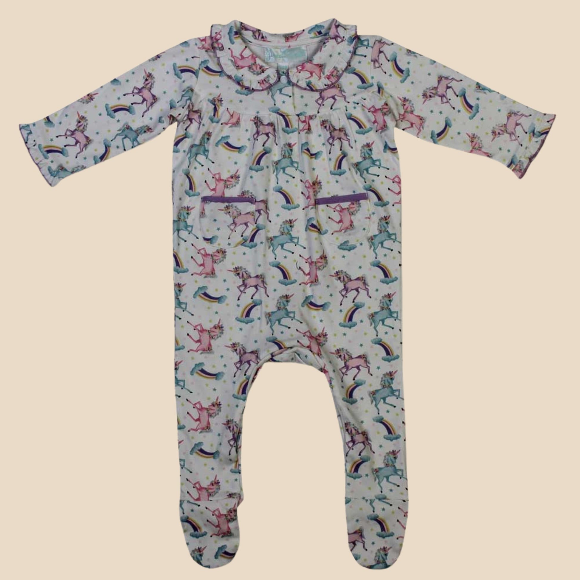 This pretty design features unicorns, rainbows, and stars in pastel hues, all set against a fresh white background. Finished with a rounded frill collar, two sweet little pockets, and frilled cuffs, it’s a charming choice for little dreamers. The neckline fastens with a fabric-covered button, while poppers between the legs make nappy changes quick and easy.